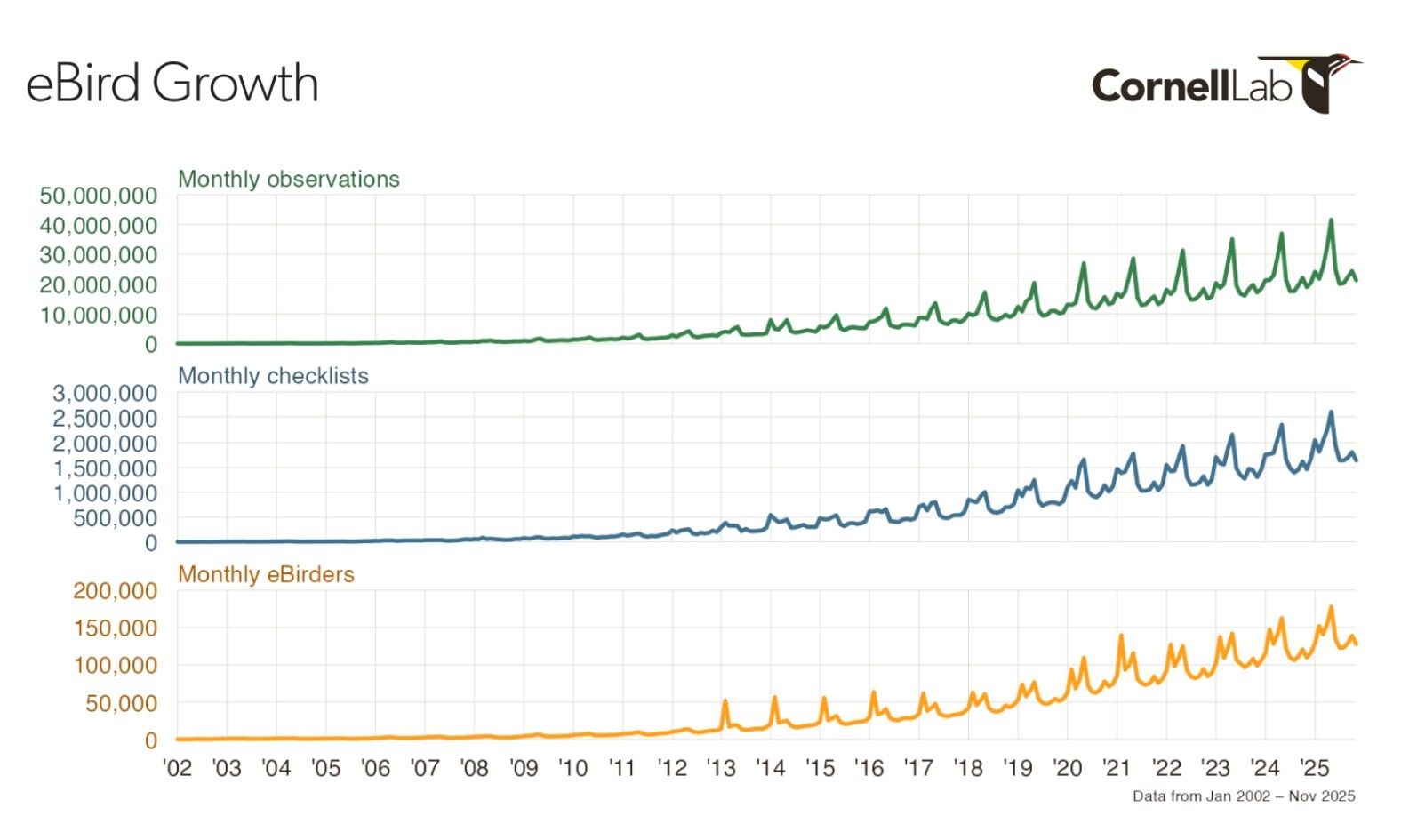 In 2025, the global birding community reached a scale never seen before. More than 140,000 people used eBird for the first time, and nearly 10 million people discovered birds through Merlin, often starting with a single sound, a single sighting, a single moment of curiosity.