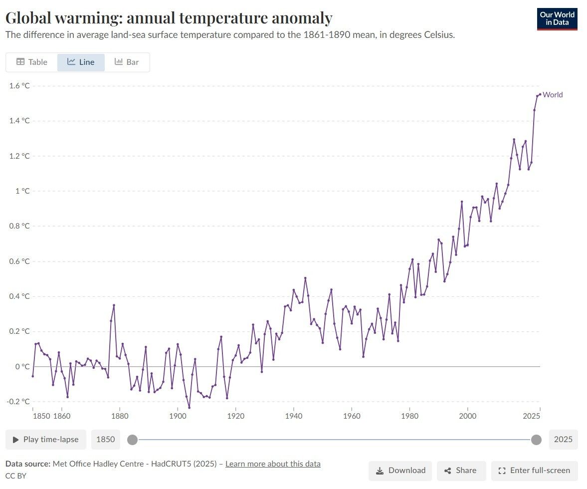 Extreme heat became the background condition! Southern Europe endured prolonged summer heat. Land and sea absorbed energy month after month. Heat is amplifying everything else on this list. Global Annual temperature for 2025 is projected to be 1.55 degrees Celsius above the 1861-1890 mean.