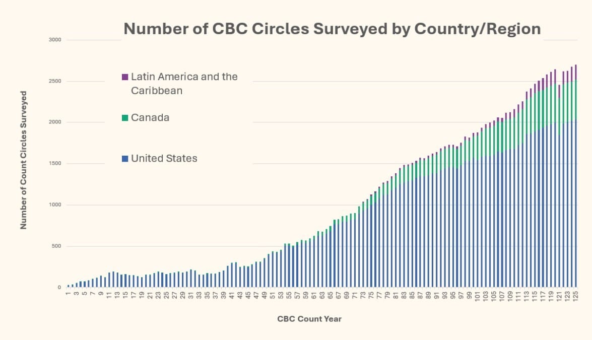 That growth is increasingly global. After a surge of new Canadian counts in the early 2000s, many of the newest Christmas Bird Count circles are now being added in Latin America and the Caribbean, expanding the program’s reach far beyond its origins.